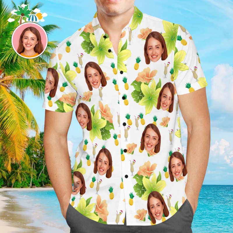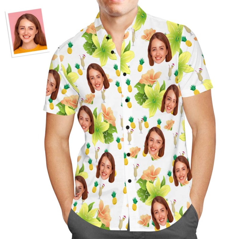 Custom Face Hawaiian Shirt Men's Popular All Over Print Shirt Pineapple Drink Flowers Holiday Gift
