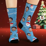 Custom Face Socks Personalized Photo Blue Socks Santa Claus and Elk
