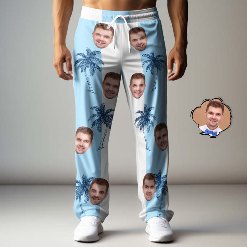 Custom Face Sweatpants Hawaiian Blue Patchwork Coconut Tree Print