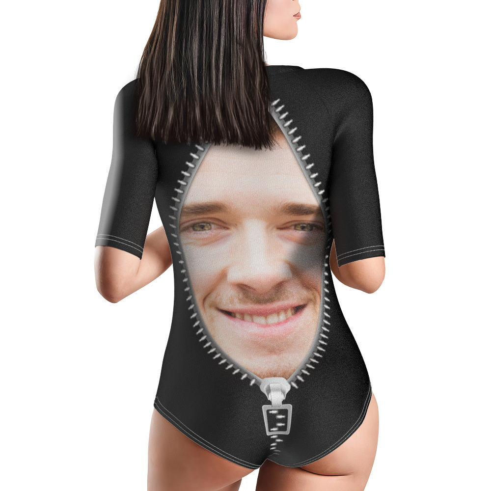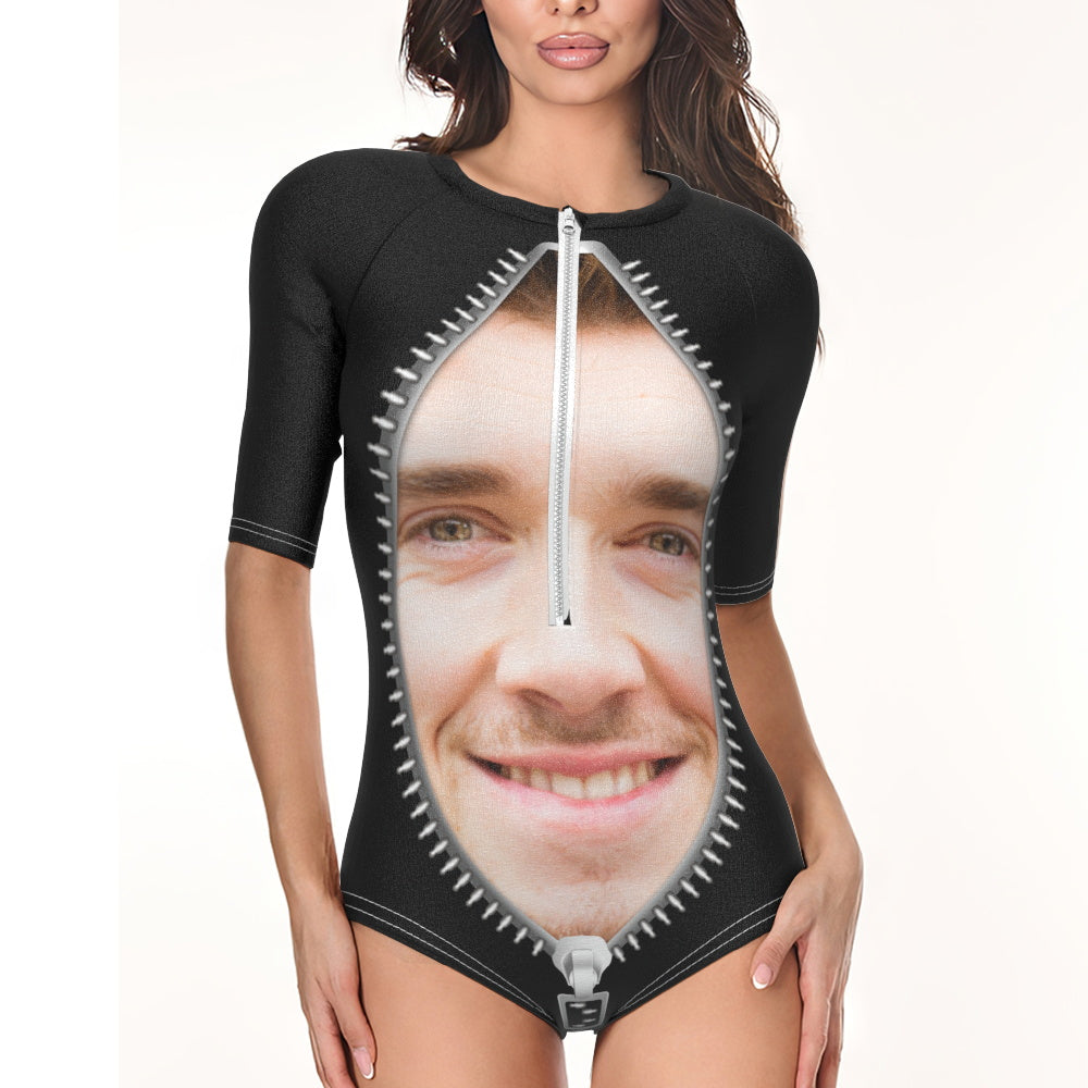 Custom Face Swimsuit One Piece Swimwear Personalized Funny Zipper Women's Half Sleeve Swimsuit