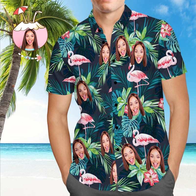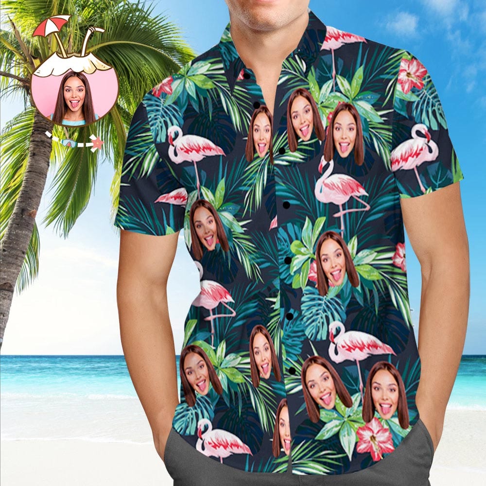 Custom Hawaiian Shirt with Face Custom Dog Face Shirt Leaves & Flamingo Hawaiian Shirts