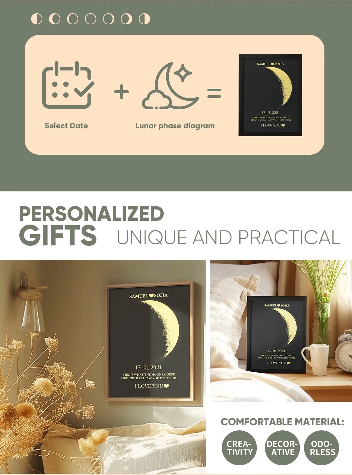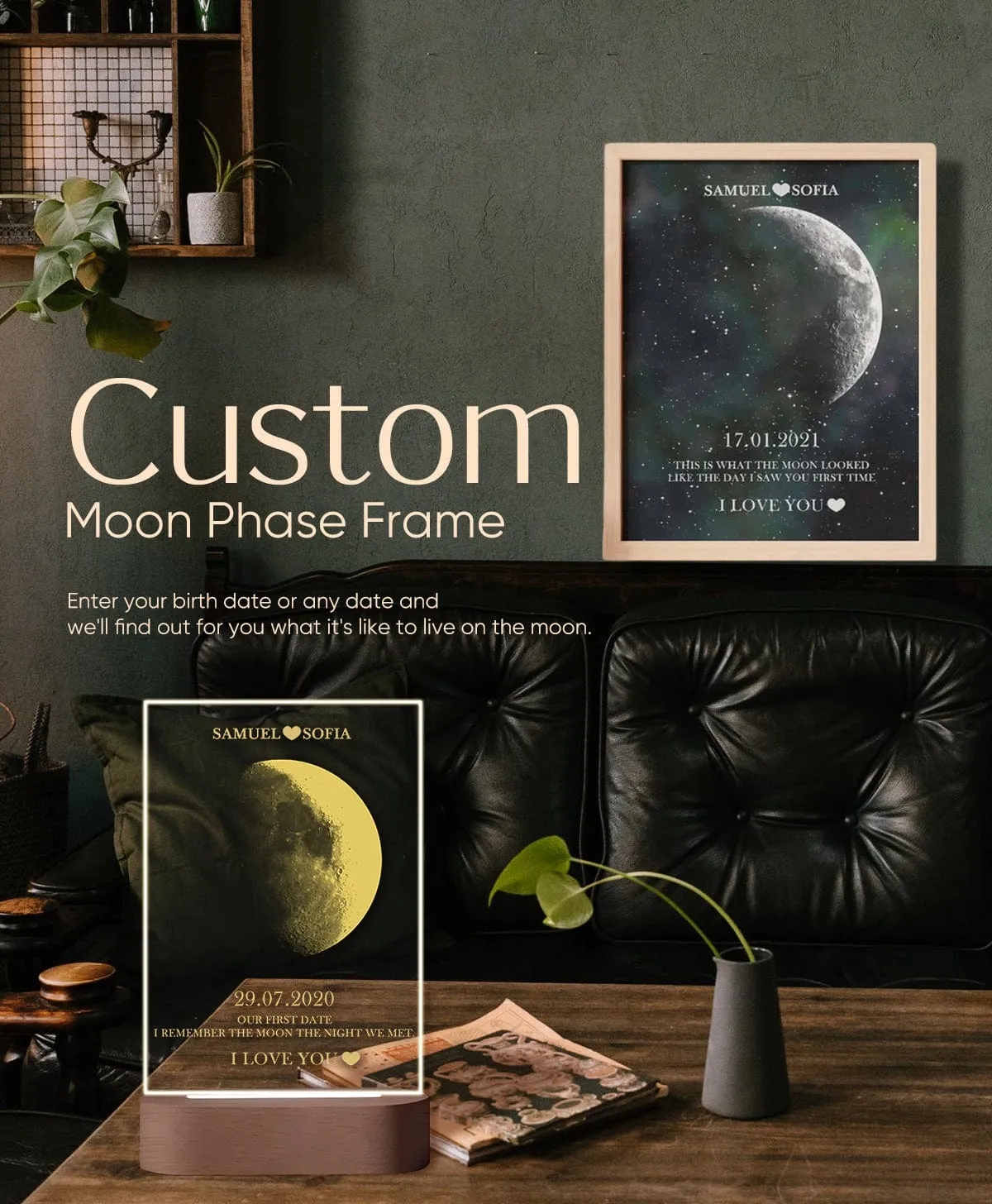 Learn the lunar phases and personalized names with our Custom Moon Phase and Names Wooden Frame. Enter a birth date to experience the moon's cycle and find out what it's like to live on the moon. This frame is an educational and unique addition to any space enthusiast's collection.