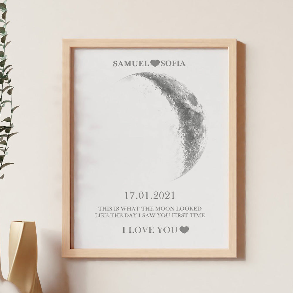 The moon night print wooden frame displays the lunar phase from the night you first met or the day you were born. Commemorate those special days and create unique and precious memories of that special night.