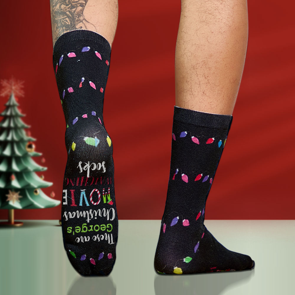 - Christmas Light Socks-Add some festive cheer to your wardrobe with these funny Christmas socks. The stockings are decorated with colorful light ribbon patterns and an interesting proverb: "These are my Christmas movies watching socks". They are perfect for the holiday season!