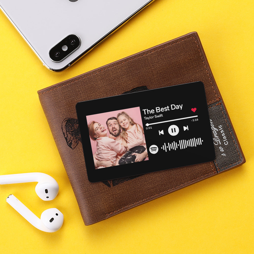 Please upload the song title, artist name and album cover or photo you want to add to the wallet insert card, and create a beautiful and unique gift for him to paste can be in your wallet and always with you. We're adding a Spotify code! Once you scan the code on Spotify, your song will start playing immediately.