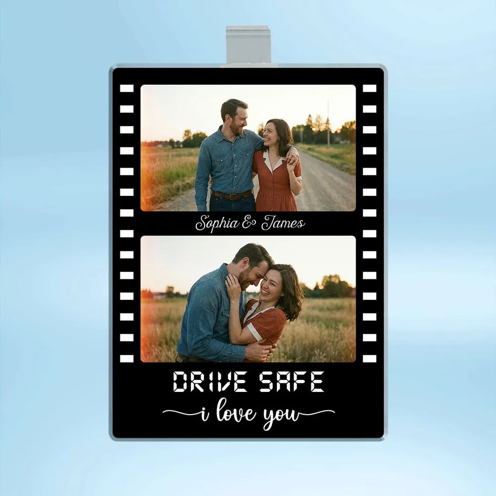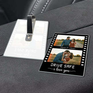 Turn every drive into a reminder of love with this personalized film strip–style acrylic car visor accessory. Designed to instantly catch attention, it showcases your favorite couple photos in a nostalgic movie reel layout paired with the heartfelt message "Drive Safe, I Love You." Customized with names and photos, it transforms everyday commutes into moments of connection and comfort. Easily displayed on the car visor, this meaningful keepsake is perfect for reminding your loved one that they’re never driving alone-making it an unforgettable gift for him or her.