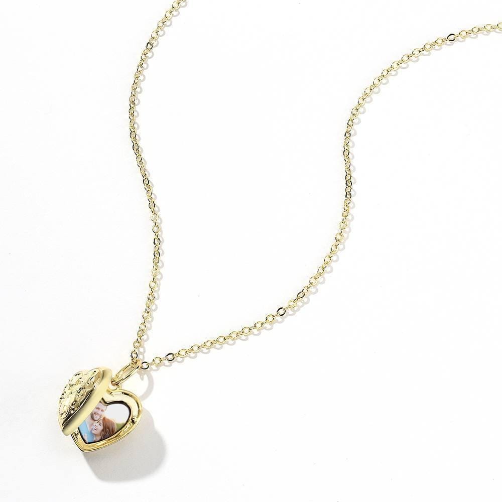 Heart Photo Locket Necklace With Name Embossed Cross Printing 14k Gold Plated