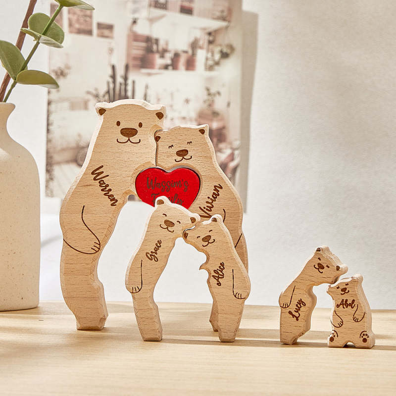 Each bear puzzle piece can be engraved with a family member's name. Each uniquely shaped piece of these personalized wooden puzzle bears brings a special family member and their love to life, making them the perfect surprise gift for any celebration.